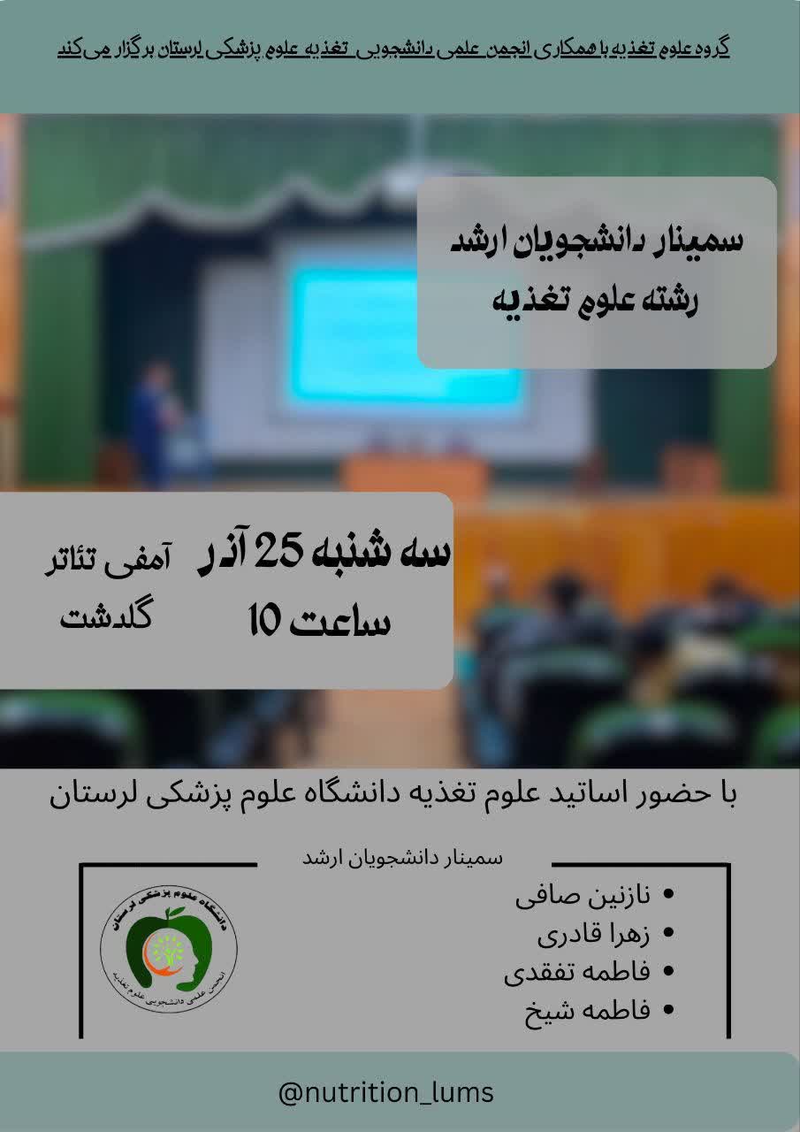 سمینارخانم ها زهرا قادری و فاطمه تفقدی، دانشجویان مقطع کارشناسی ارشد رشته علوم تغذیه و خانم ها فاطمه شیخ و فاطمه ساجدی فر، دانشجویان مقطع کارشناسی ارشد رشته تغذیه جامعه